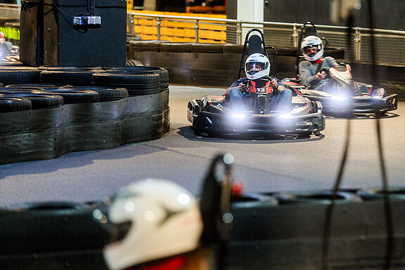 Wer nach den Vorträgen den Kopf etwas freibekommen wollte, nahm sich eine Auszeit und nutzte die Attraktionen und Aktivitäten. Das Rahmenprogramm bot verschiedene Actionspiele – von der Pit-Stop-Challenge über Rennsimulatoren bis hin zum Multimediaerlebnis rund um den Nürburgring – sowie eine historische Ausstellung im ring°werk. Unter dem ring°werk stand die Kartbahn für den Adrenalinkick zur Verfügung. Die E-Karts erfreuten sich großer Beliebtheit und sorgten auf der kurvigen Strecke für Euphorie. Ein weiteres Highlight waren die Trackwalks. Bei den von einem Guide geführten Touren auf der Rennstrecke erhielten die Teilnehmerinnen und Teilnehmer spannende und erstaunliche Hintergrundinformationen zu bestimmten Streckenabschnitten. Mit jedem Schritt spürten sie die beeindruckende Atmosphäre der legendären "Grünen Hölle". Auf der Tribüne der Start- und Zielgeraden konnten teilweise sogar richtige Rennwagen bei Testfahrten bestaunt werden – ein unvergesslicher Sound, wenn diese mit Top-Speed vorbeifahren.